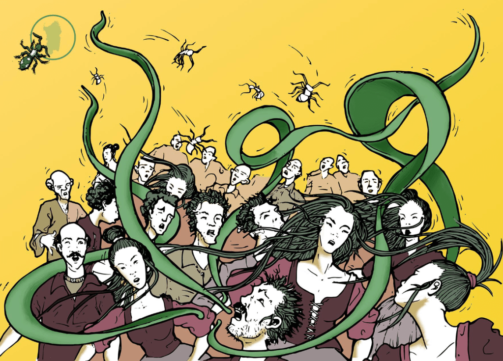 He explains that because the spider dances to a rhythm and music which suit it, “its bite participates in the melody, in the dance, in the colours – it communicates, to the person who endured it, the corresponding preferences and injects into their veins a poison whose harmfulness lasts as long as the spider is alive and whose effects come to an end when the bitten person, thanks to the agonistic identification of the dance, makes the poisoning creature ‘die'”. [23]