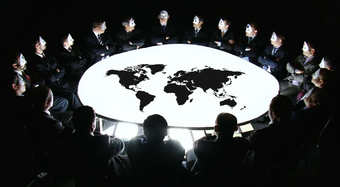 Where does the photo of the masked men sitting around a round table w/ an image of the continents on it? I thought maybe Dr Strangelove, but don’t remember the masks. Also I thought of flat earth imagery. They often show a flat disc w/ earth’s topography similar to this one.