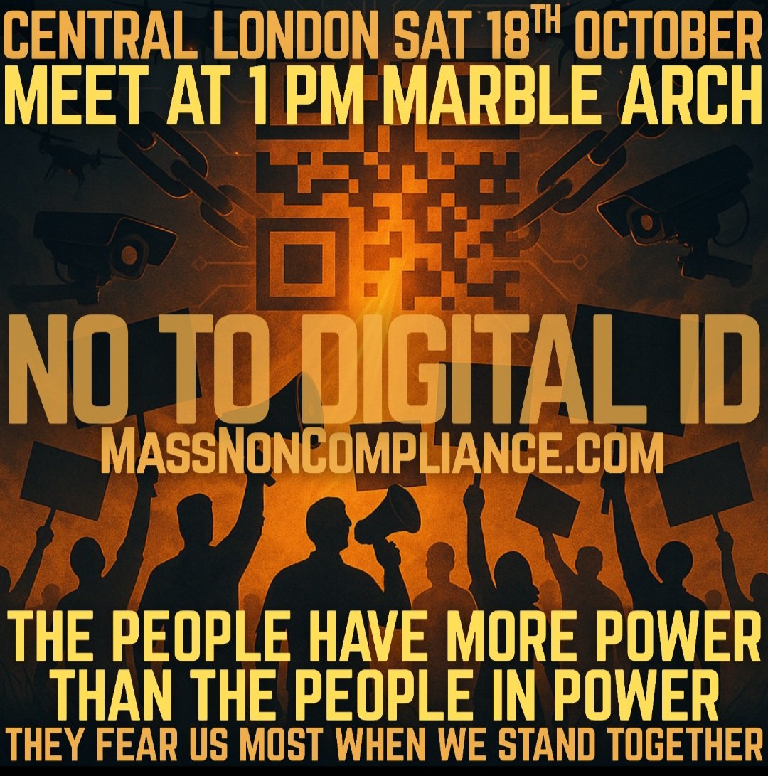 Calling for a mass non-compliance protest at Marble Arch, central London, from 1pm on Saturday October 18, freedom campaigner Fiona Rose Diamond warns: “Imagine a life lived under relentless surveillance, permissioned gateways, systems that log, rank & revoke.