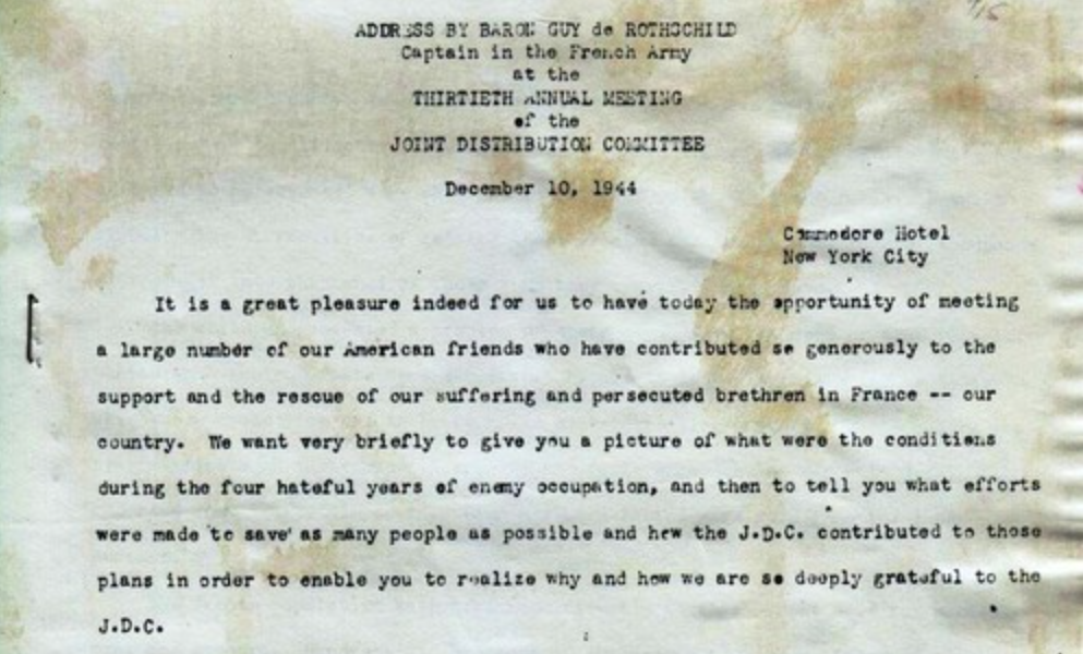 I see that at the JDC’s 30th annual meeting in New York in December 1944, a speech was given by Baron Guy de Rothschild, which was published in printed form, though I have been unable to track down the full text. [59]