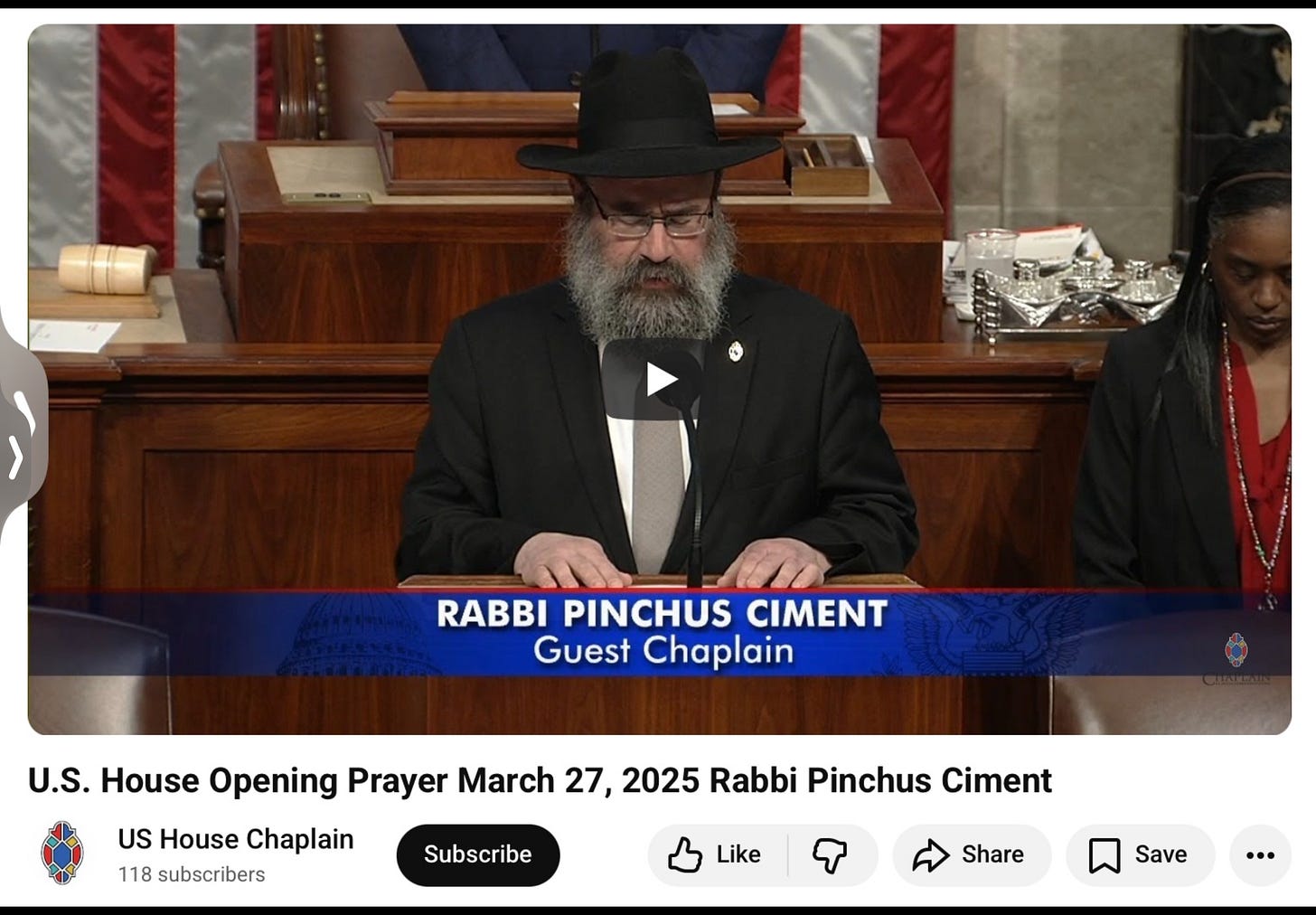 Prayer by Rabbi Pinchus Ciment explicitly mentioning the Seven Noahide Laws was offered on March 27, 2025, when he served as guest chaplain opening an official session of the United States House of Representatives.