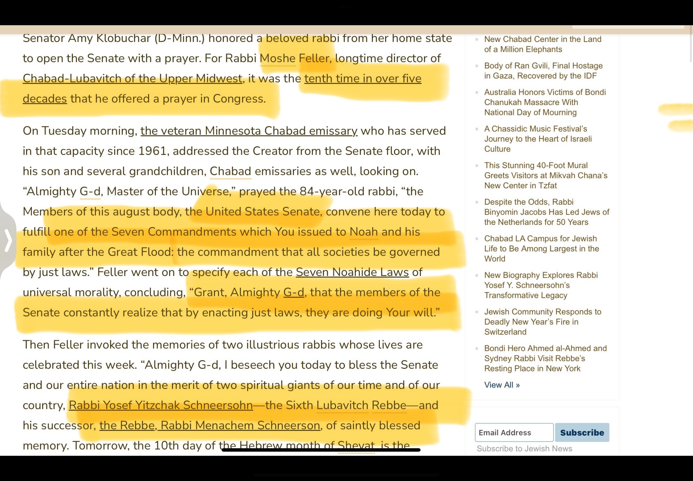The implication is powerful. It suggests that the God referenced in the pledge is the same God who endorses the Noahide Laws, and there appears to be no questioning of this assumption by our political leaders. Instead, the rabbis are publicly honored, their prayers affirmed, and the events proudly announced afterward on Chabad’s own websites.