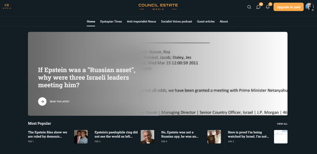 | A lot of dissident voices have been drawing attention to the clearly Zionist nature of Epstein’s nefarious activities. For instance, Rares Cocilnau writes in The Canary of “Epstein’s role in geopolitical manoeuvring, using intelligence networks for financial and strategic gains aligned with Israeli interests”. |