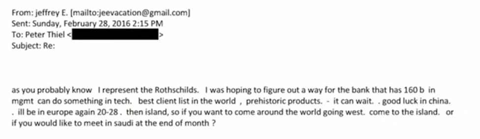 | Epstein even presented himself to Peter Thiel of Palantir by saying: “As you probably know I represent the Rothschilds…” |