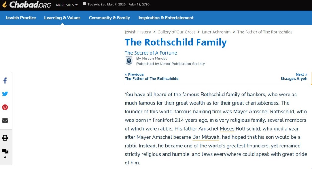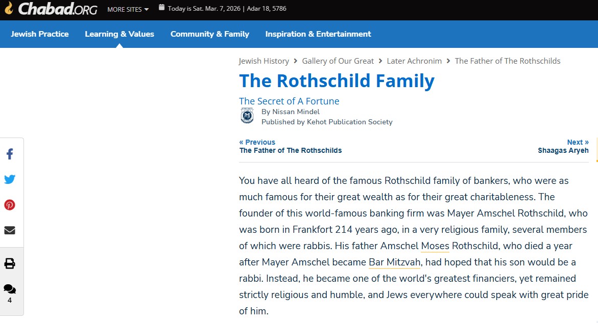Chabad Lubavitch, the Orthodox Jewish organisation with a network of more than 3,600 institutions in over 1,000 cities, spanning 70 countries, is very proud of the Rothschilds, as it explains on its website.